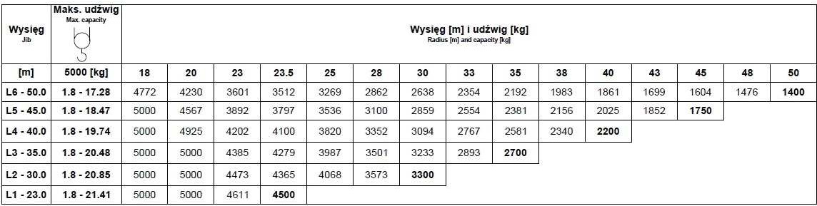 14. W oparciu o przedstawiony diagram udźwigu wskaż maksymalną masę ładunku jaką można przetransportować na odległość 18 m, przy długości wysięgnika L6. Transport ładunku odbywa się przy użyciu trawersy belkowej zawieszonej na haku żurawia (DOR trawersy - 450