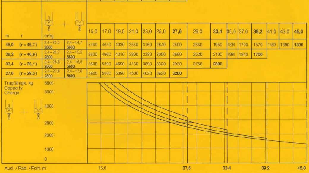 13. Zgodnie z poniższym diagramem udźwig żurawia w wersji montażowej z wysięgnikiem o długości 33,4m, na wysięgu 17m, przy dwóch pasmach liny wynosi